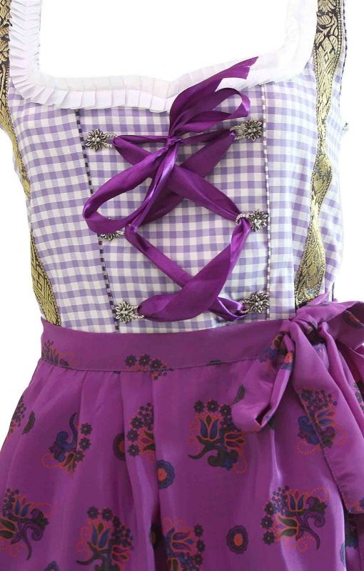 Put on drama with the Women’s Premium Lilac Purple Dirndl Dress which is ideal for Oktoberfest and other Bavarian-themed events. This dirndl dress is made of soft, light 100% cotton and has a beautiful mauve and white check design. The bodice has side beautiful golden lace which looks great against the bright lilac fabric.